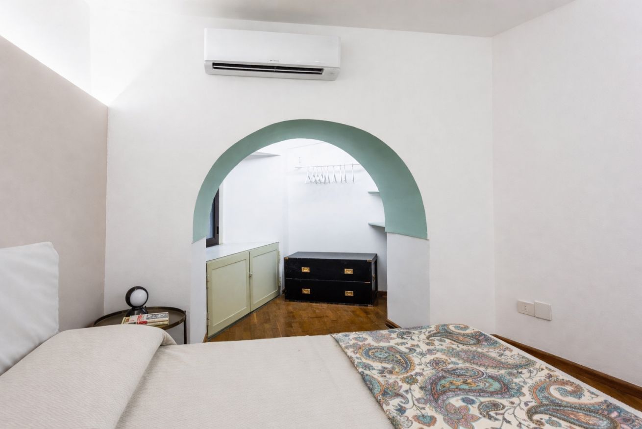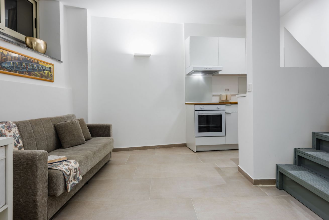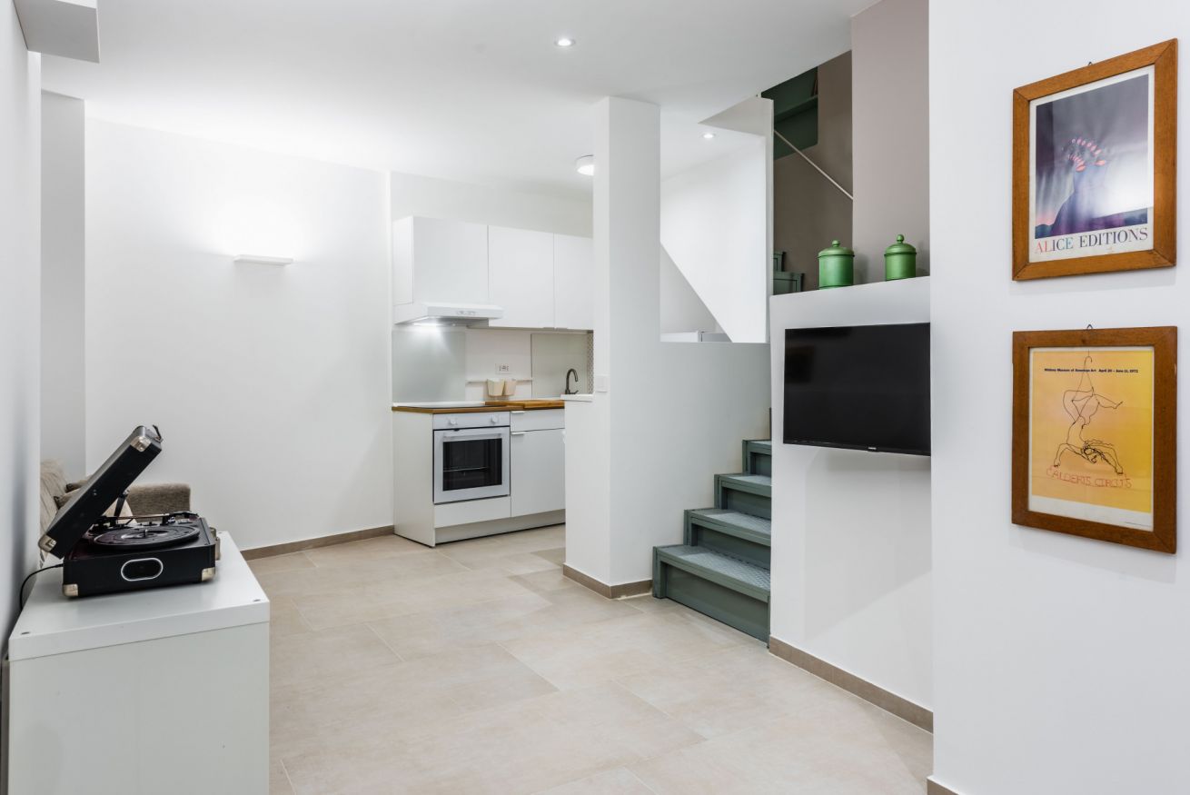 Building stairs give access to the apartments (first floor) and internal stairs connect the kitchen/living room to the two bedrooms on the upper floor. No elevator. Air conditioning in all rooms.