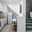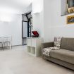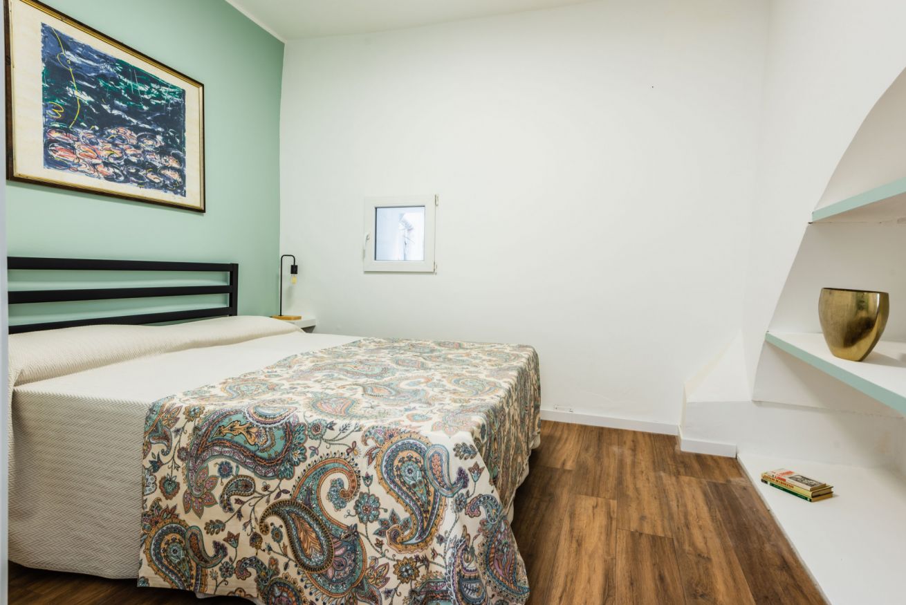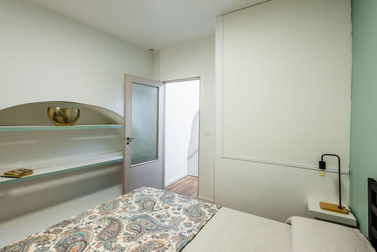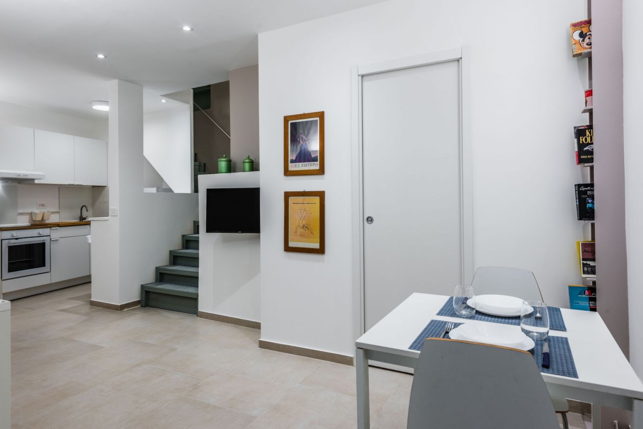 Building stairs give access to the apartments (first floor) and internal stairs connect the kitchen/living room to the two bedrooms on the upper floor. No elevator. Air conditioning in all rooms.